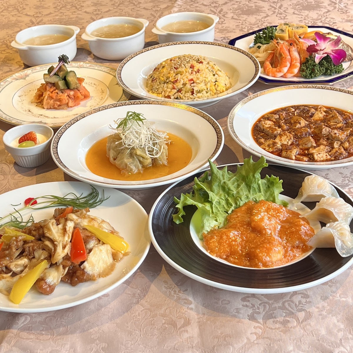 フカヒレスープ、夢の大地豚の牡蠣油炒め、中華風ロールキャベツなど